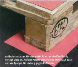 Anti-slip mats may be placed under pallets as strips. On the pallet, a mat based on corrugated cardboard prevents slipping of the cargo.