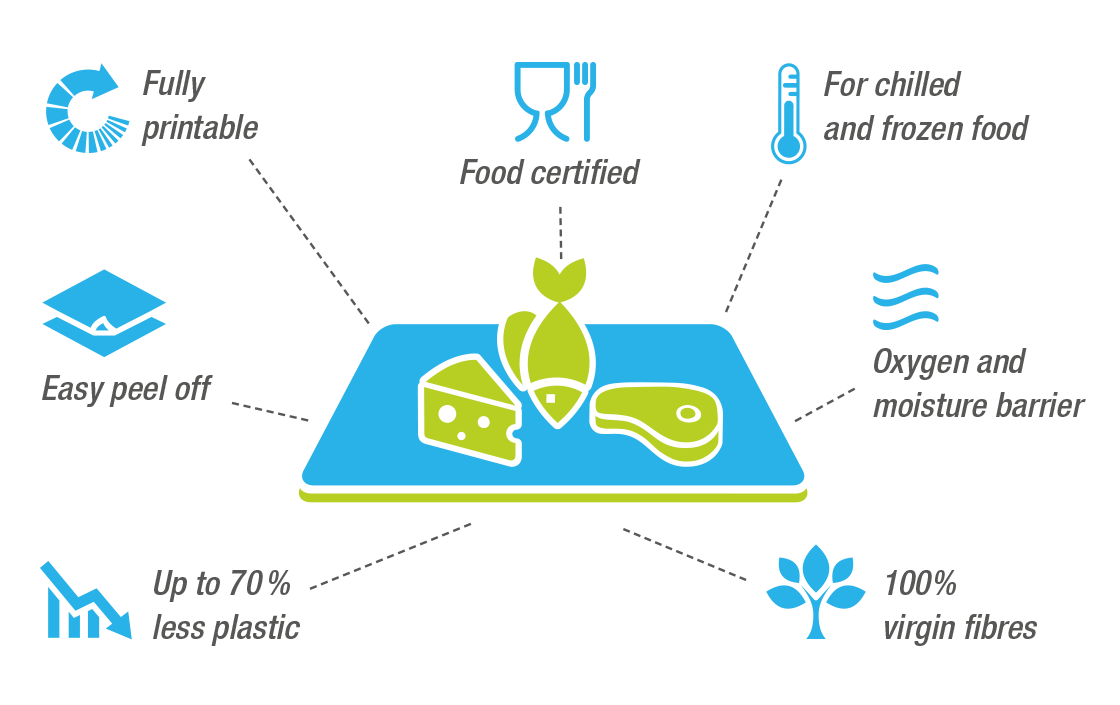 By using MULTi-Cargo FreshBoard, a sturdy product carrier made from 100% fresh fibre cardboard, the plastic content of vacuum packaging can be reduced by up to 70%. Thanks to the skin coating on the cardboard base, the climatic advantages of vacuum packaging remain identical to those of comparable full plastic packaging, e.g. with plastic backs or plastic trays. The cardboard coated using the skin process is also protected against moisture inside refrigerated and frozen storage rooms and retains its shape and protective function even in damp external environments.